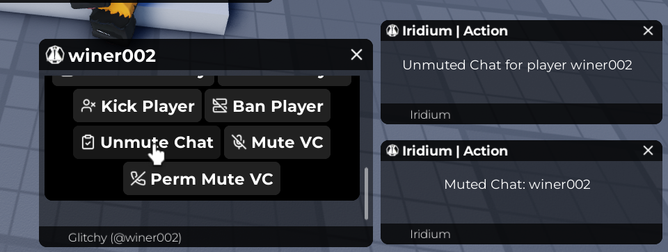 - Player Management – Chat/VC Mute + Unmute, Kick/Ban, Perm Mute